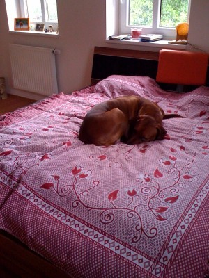 Jo a že tu mám tu sedačku, tsss, ať si na ní páníci sedají sami, já si oblíbila už něco jiného - v ložnici mají takovou veeeelikááánkskou postel :)